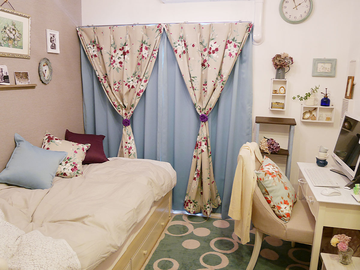 ダブルカーテンレールをやめて、簡易シェード「シンプリー」をつっぱり棒で内付けにしてスマート化。カーテンレールをシングルに付け替えて、窓からの出幅を小さくしたことにより、お部屋を少しでも広く見せました。