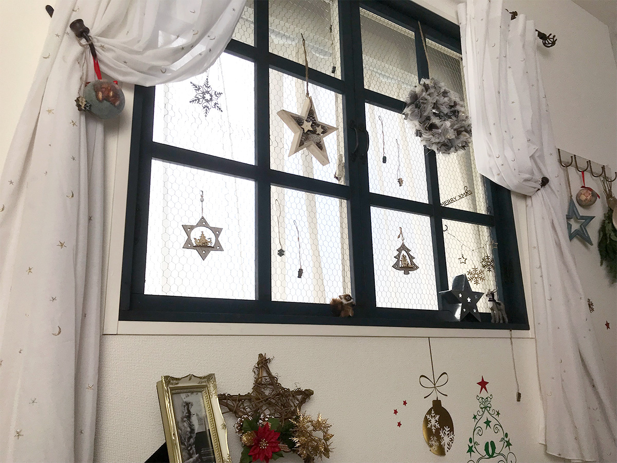 黒板ウォールシールで子供たちの落書きコーナーと、クリスマス仕様のウォールステッカーでデコレーション。ブラックボードはシックなインテリアにもよく合い、おしゃれなお部屋になりました!