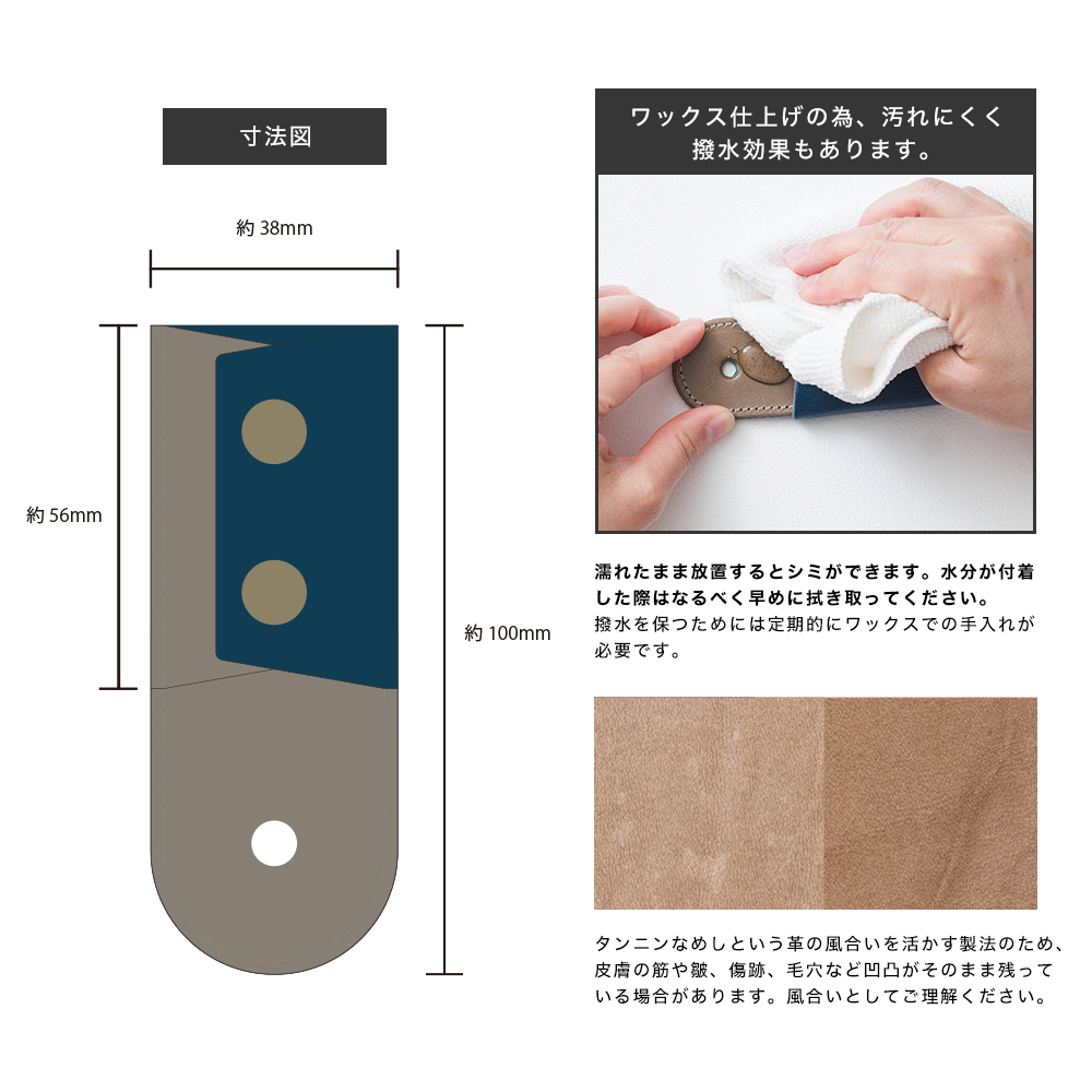 - タンニンなめしのため色は部位により濃淡に差がでます。また、ネイビーの裏面は染の仕上げ製法によりムラがある場合がございます。ご了承ください。