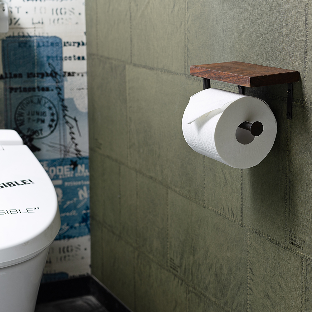 ヴィンテージ感のあるアイアンのアームに、マンゴーウッドの小さな棚がついたトイレットペーパーホルダー。